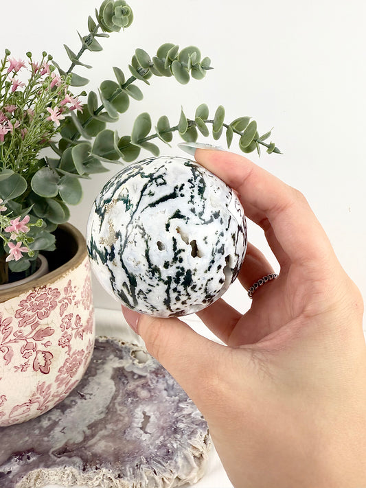 Moss Agate Large Sphere with Glass Stand