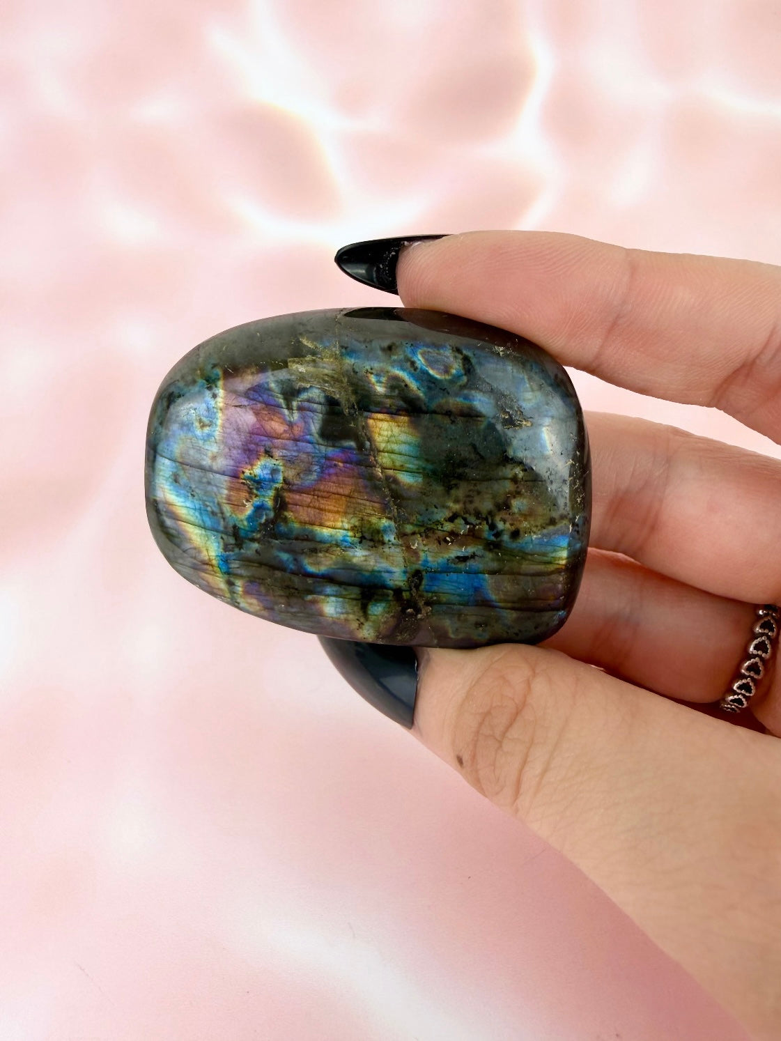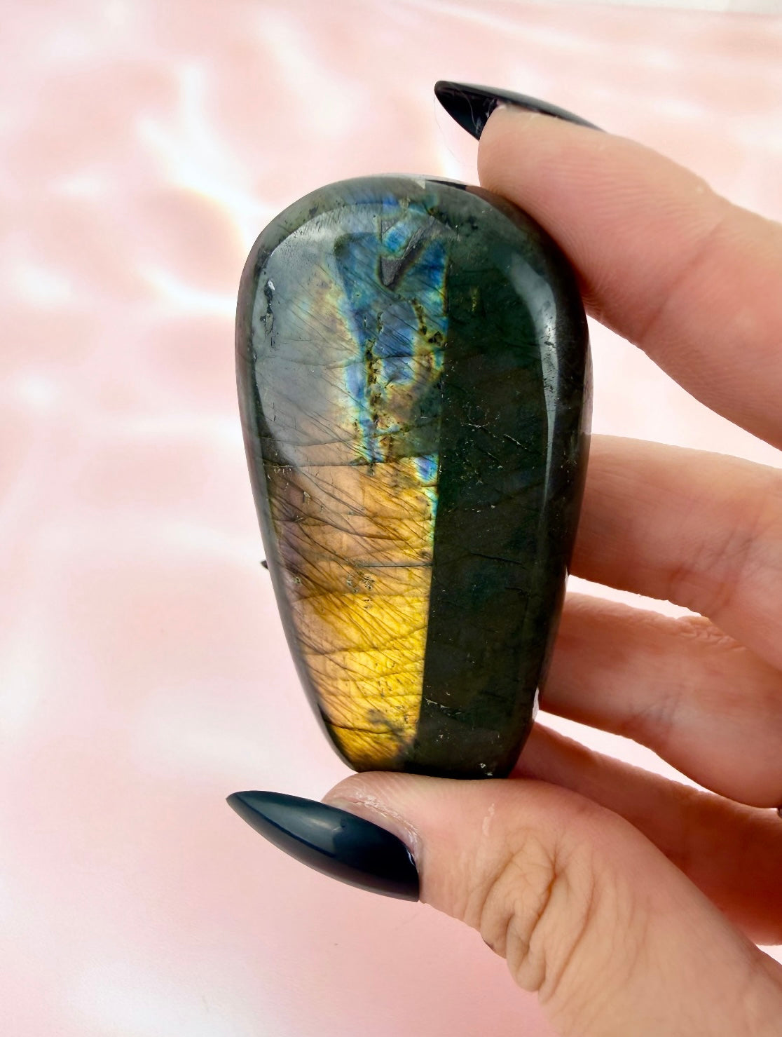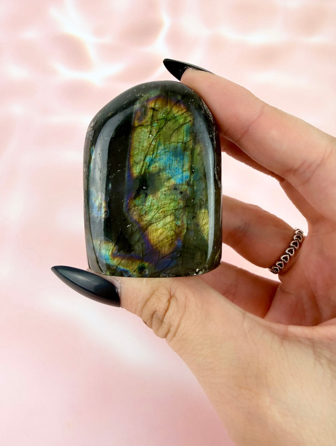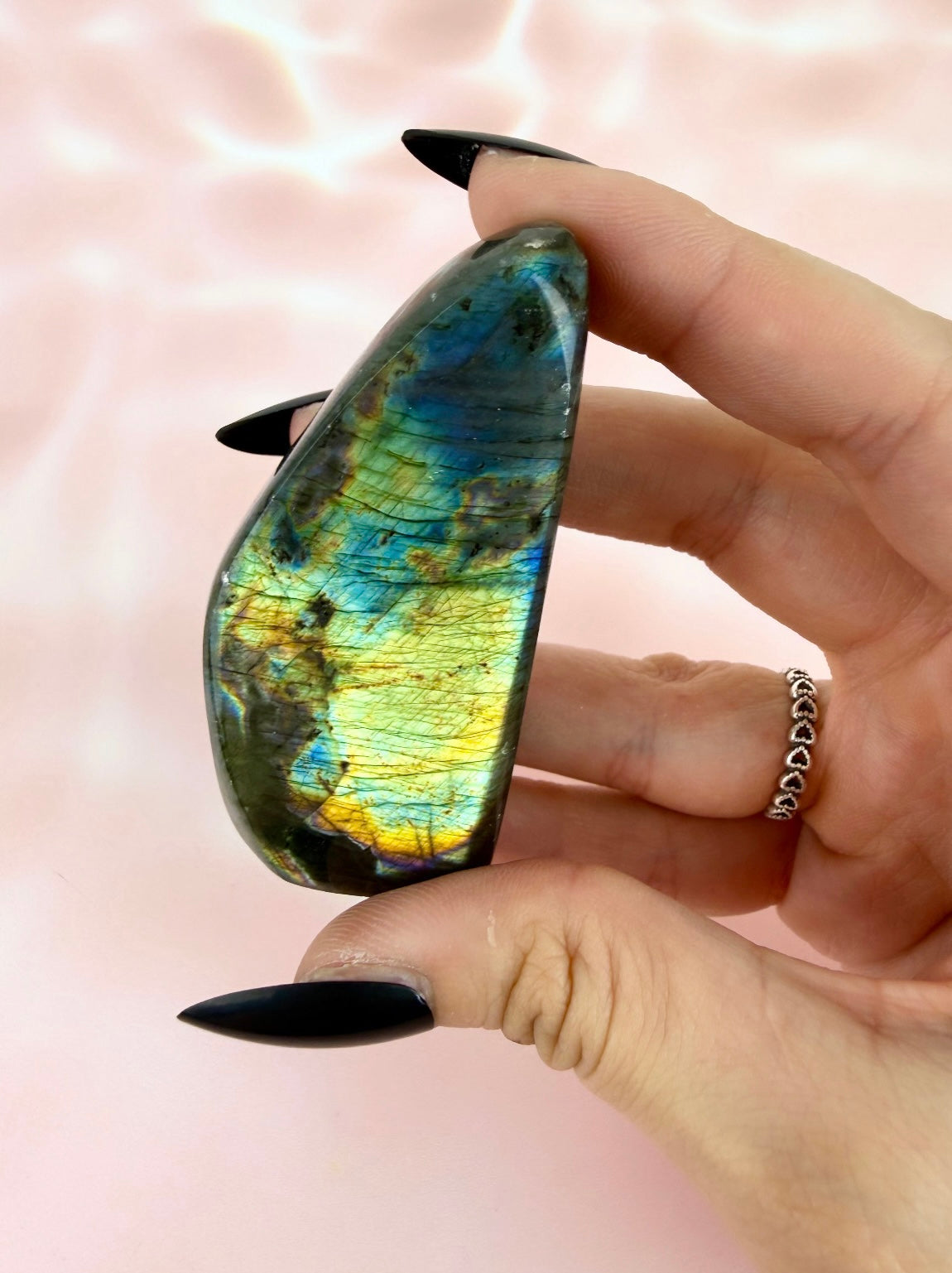 these labradorite rainbow freeforms are individually selected for strong flash. you will receive the exact stone shown.