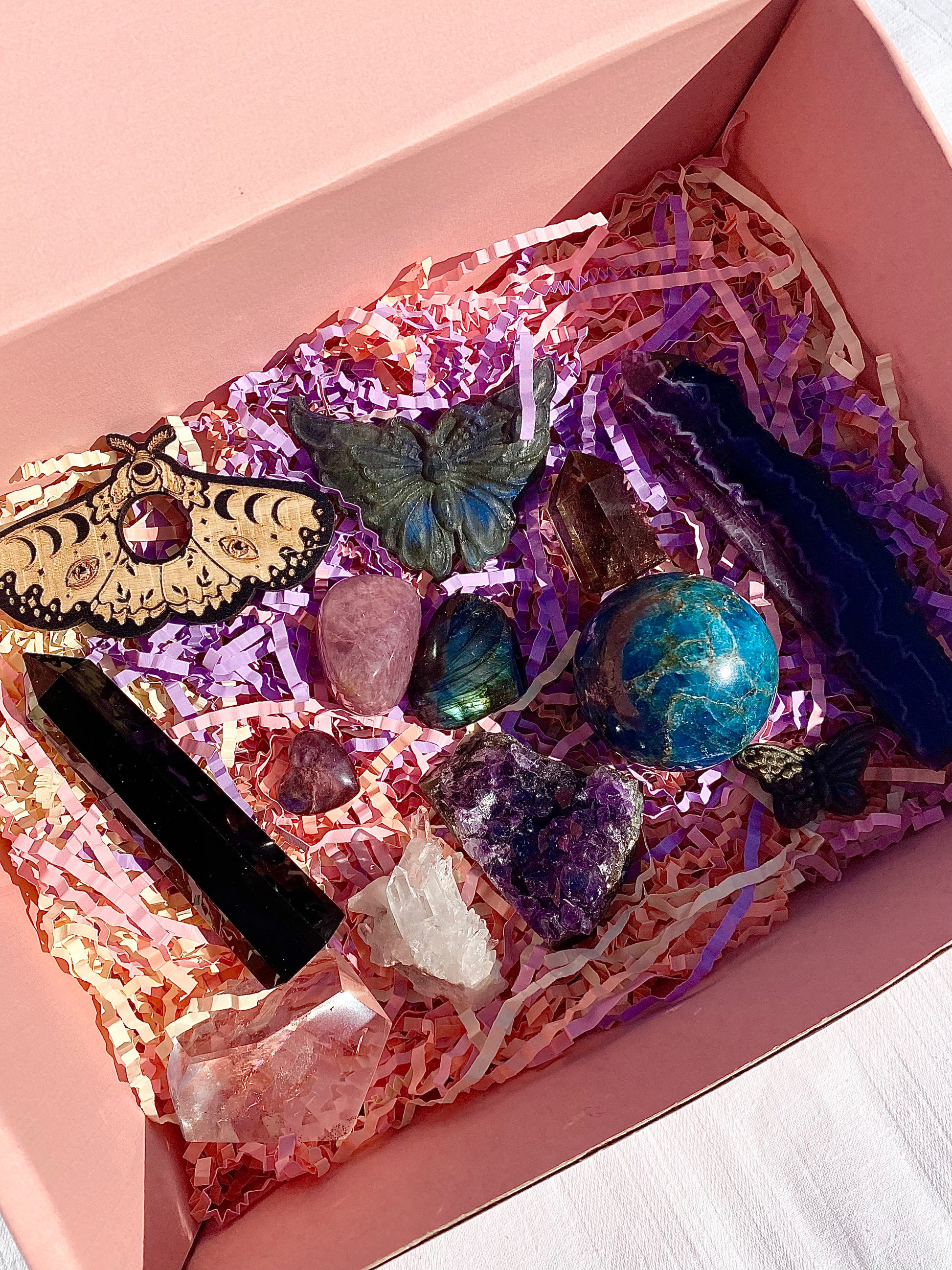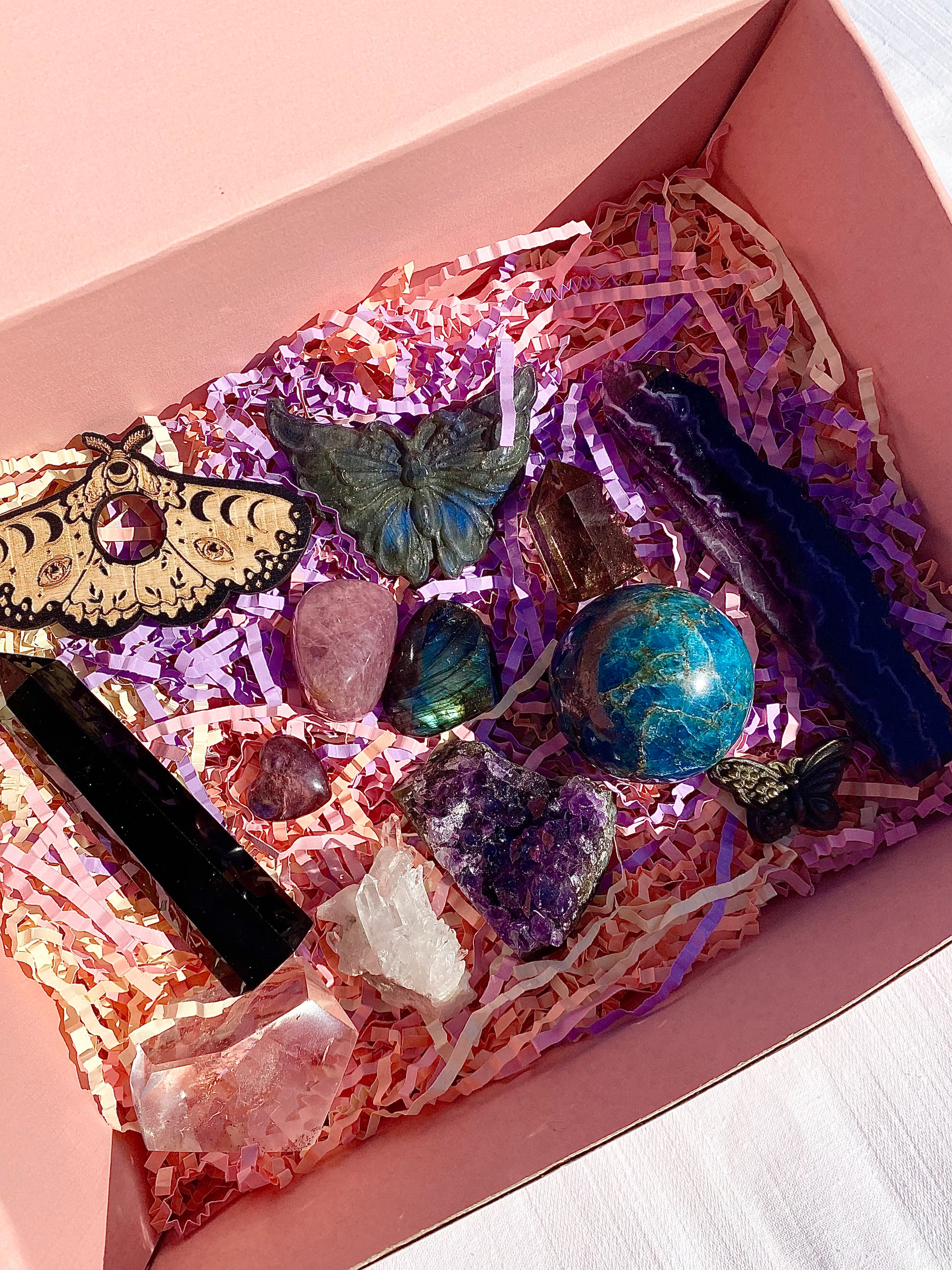 Our themed mystery boxes are perfect for any crystal lover that wants to expand their collection whether they already have a theme going on or not! There is still an element of surprise and mystery with these boxes as the examples shown may not be exactly what you may receive but rather a little sneak peak into the world of your chosen mystery box.