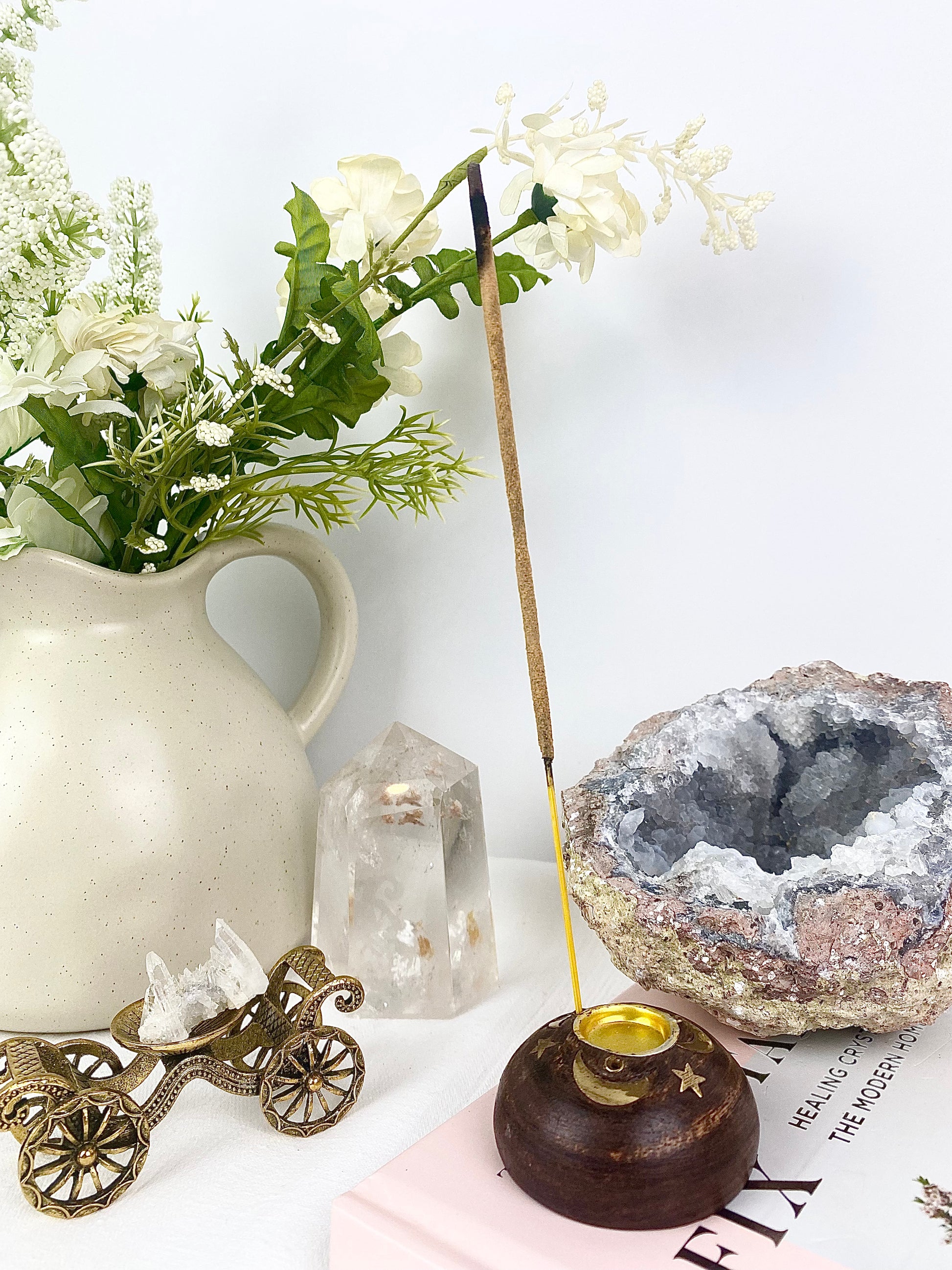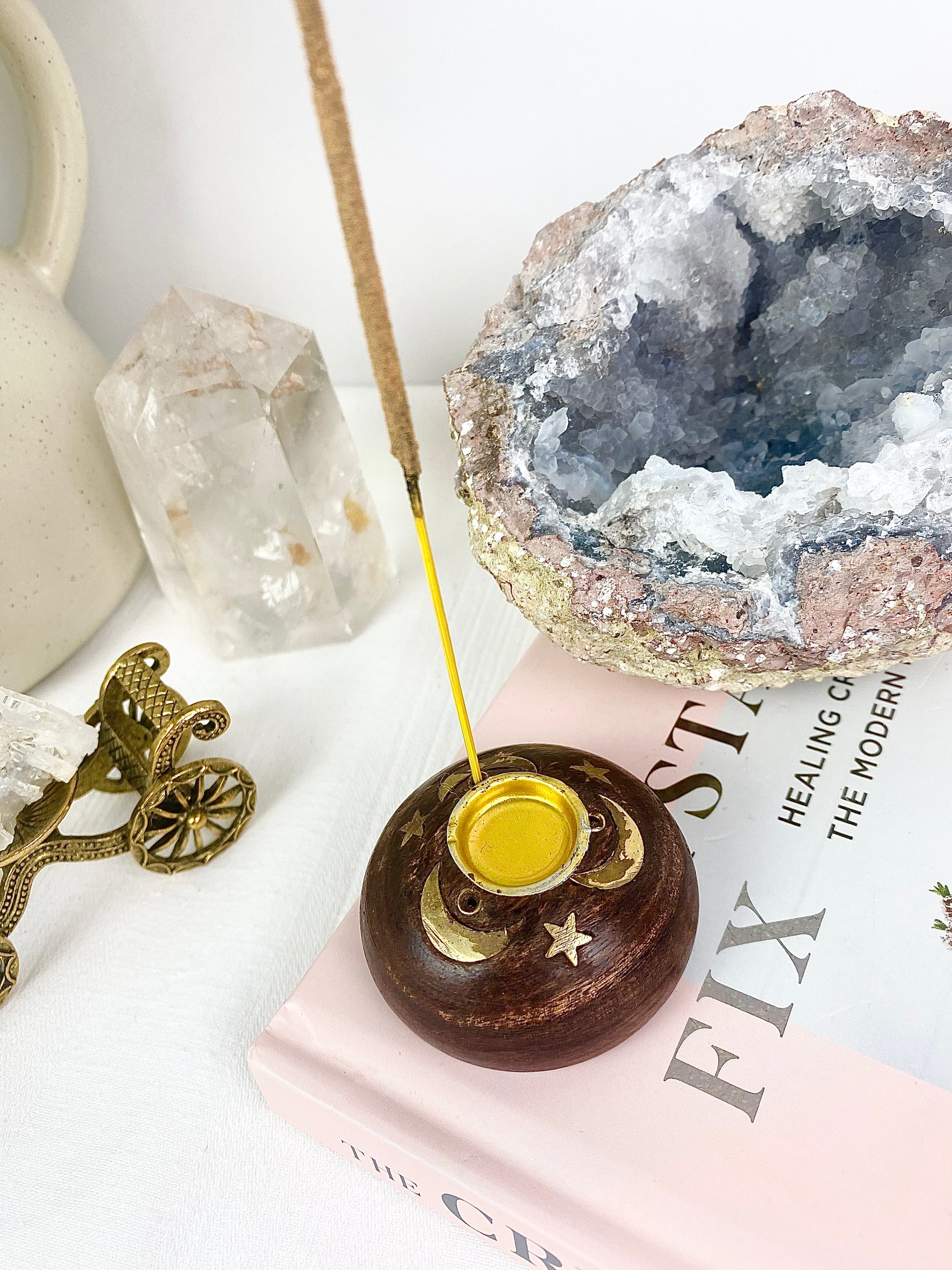 made from wood, holds incense and cones. can hold up to 3 incense at once.
